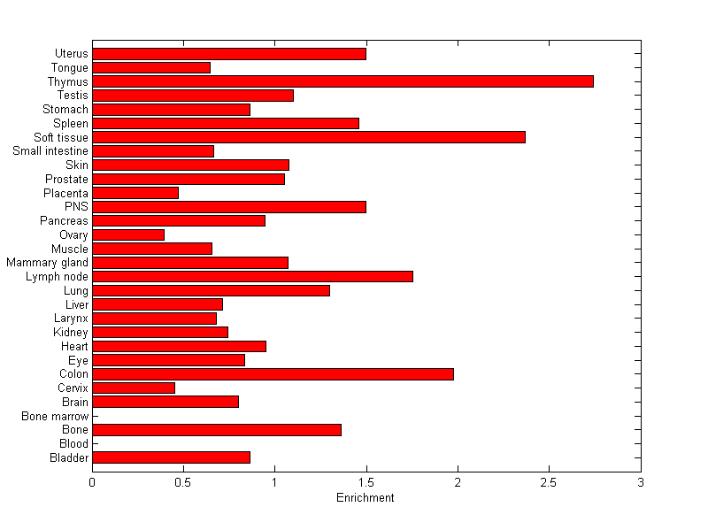 The expression level is normalized with tissue-library size. Each value for a gene in a tissue is a ratio of observed ESTs to the expected one in this tissue. The expected number of ESTs is the product of total ESTs of the gene and the fraction of total ESTs in the tissue among all ESTs in 30 tissues.