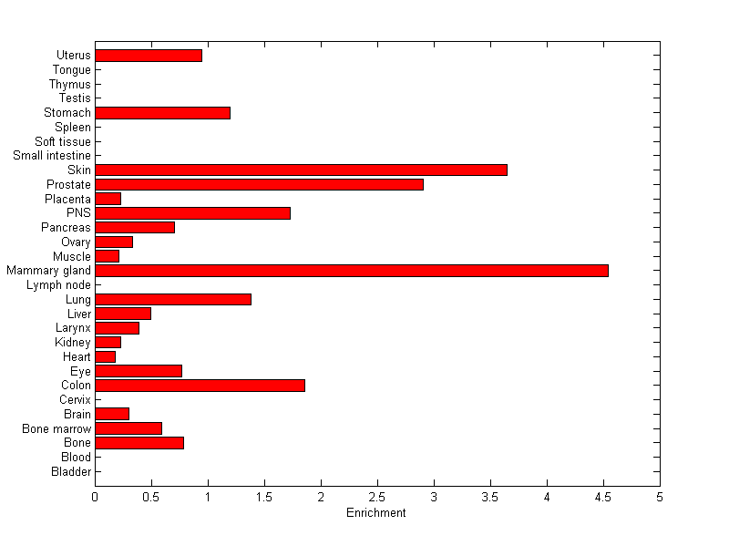 The expression level is normalized with tissue-library size. Each value for a gene in a tissue is a ratio of observed ESTs to the expected one in this tissue. The expected number of ESTs is the product of total ESTs of the gene and the fraction of total ESTs in the tissue among all ESTs in 30 tissues.