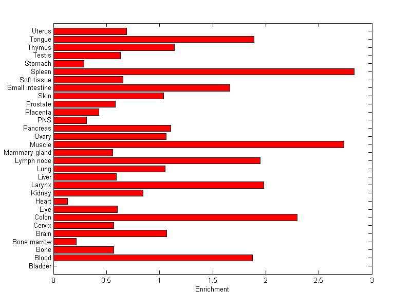 The expression level is normalized with tissue-library size. Each value for a gene in a tissue is a ratio of observed ESTs to the expected one in this tissue. The expected number of ESTs is the product of total ESTs of the gene and the fraction of total ESTs in the tissue among all ESTs in 30 tissues.