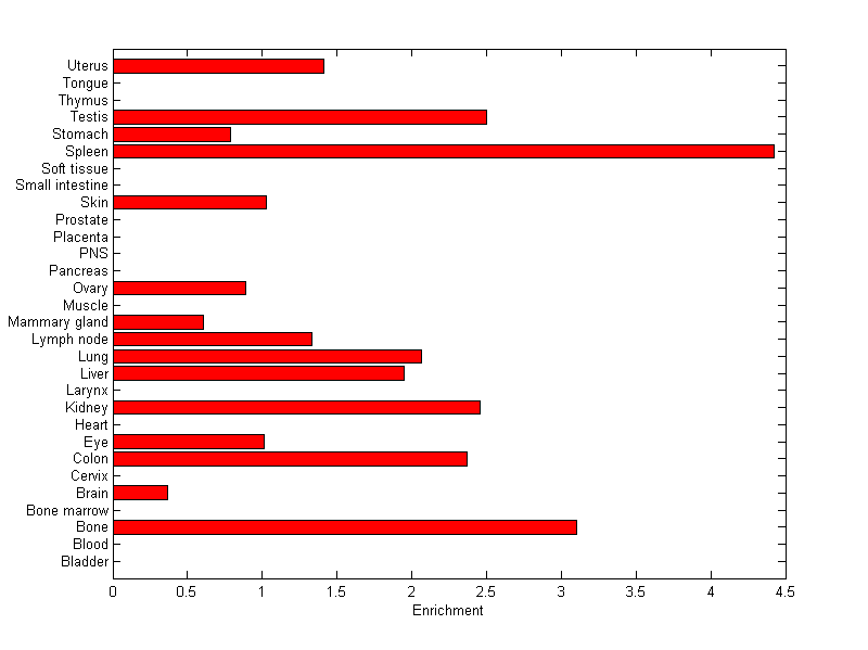 The expression level is normalized with tissue-library size. Each value for a gene in a tissue is a ratio of observed ESTs to the expected one in this tissue. The expected number of ESTs is the product of total ESTs of the gene and the fraction of total ESTs in the tissue among all ESTs in 30 tissues.