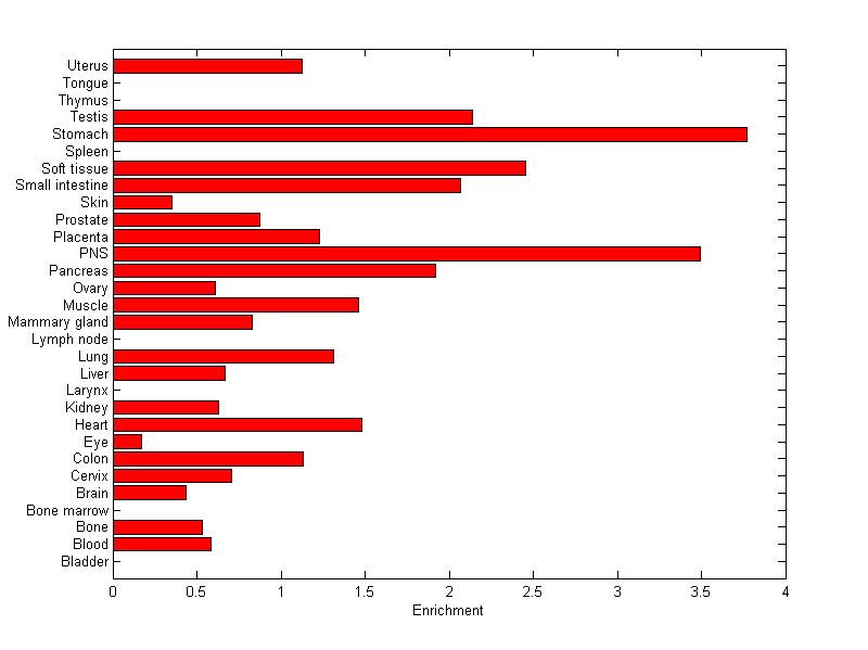 The expression level is normalized with tissue-library size. Each value for a gene in a tissue is a ratio of observed ESTs to the expected one in this tissue. The expected number of ESTs is the product of total ESTs of the gene and the fraction of total ESTs in the tissue among all ESTs in 30 tissues.