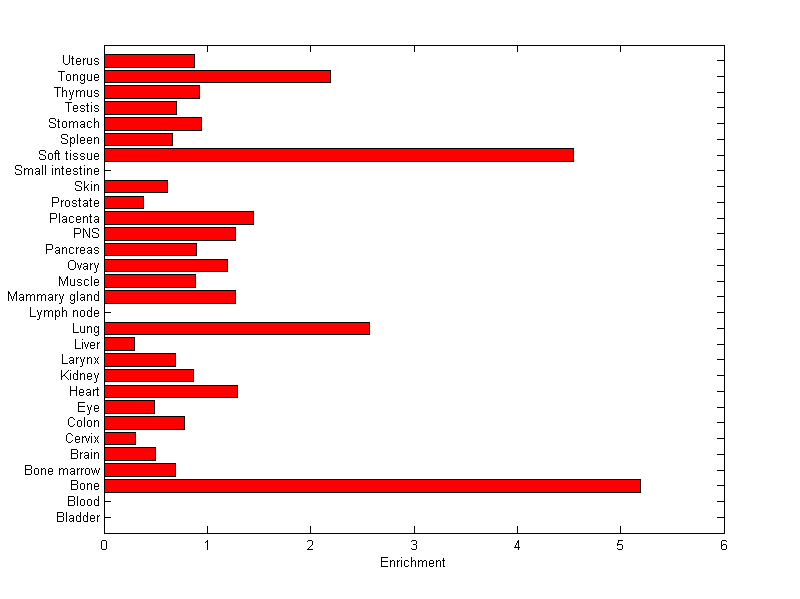 The expression level is normalized with tissue-library size. Each value for a gene in a tissue is a ratio of observed ESTs to the expected one in this tissue. The expected number of ESTs is the product of total ESTs of the gene and the fraction of total ESTs in the tissue among all ESTs in 30 tissues.
