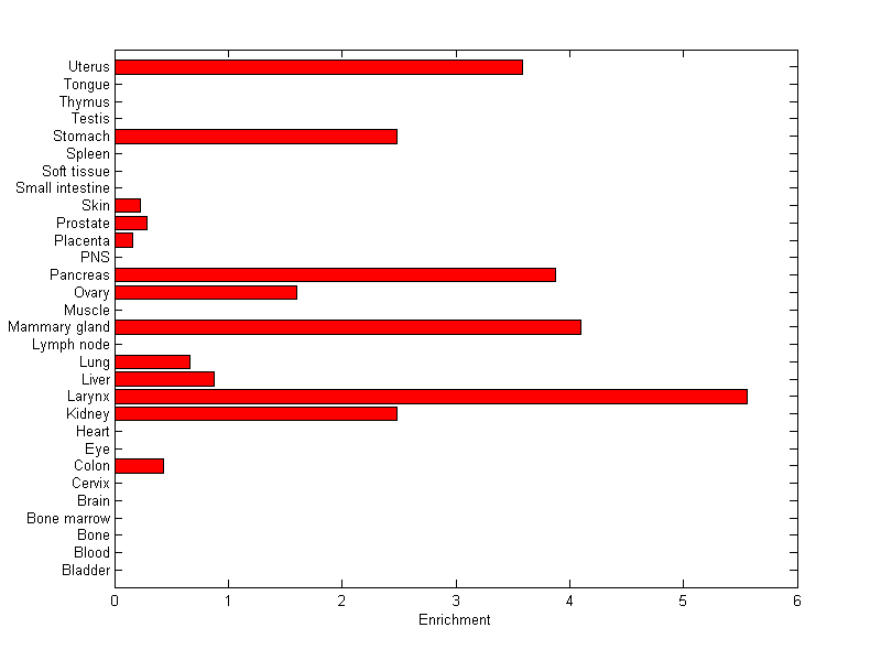The expression level is normalized with tissue-library size. Each value for a gene in a tissue is a ratio of observed ESTs to the expected one in this tissue. The expected number of ESTs is the product of total ESTs of the gene and the fraction of total ESTs in the tissue among all ESTs in 30 tissues.