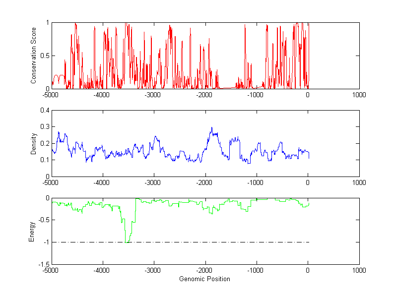 About the profiles: The conservation profile (red curve) is about conservation scores of the promoter sequences. Conservation was determined from an eight-way alignment of human, chimpanzee, dog, mouse, rat, chicken, zebrafish and fugu sequences. The conservation was quantified by a conservation score between 0 and 1, with 1 as highest conservation. The conservation score was obtained from UCSC genome databases. The density profile (blue curve) is about density of all TF binding sites. The energy profile (green curve) is about energy for module detection based on TF interaction. The positions with energy less than -1 indicate the existence of CRMs. Download: Conservation profileDensity profile Energy profile CRM summary |