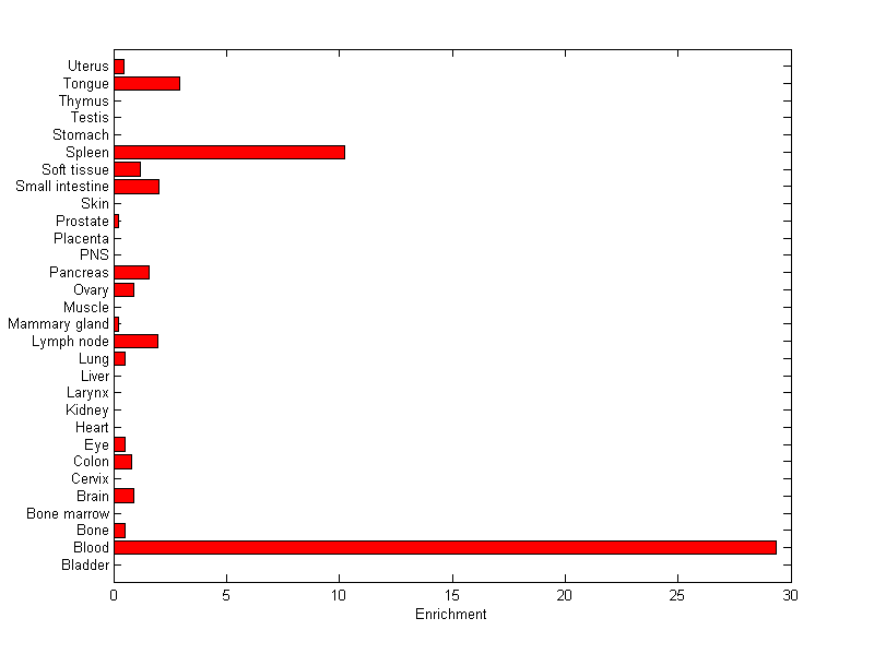 About the profile: The expression level is normalized with tissue-library size. Each value for a gene in a tissue is a ratio of observed ESTs to the expected one in this tissue. The expected number of ESTs is the product of total ESTs of the gene and the fraction of total ESTs in the tissue among all ESTs in 30 tissues. Summary: This gene is preferentially expressed in [blood, spleen] Download: |