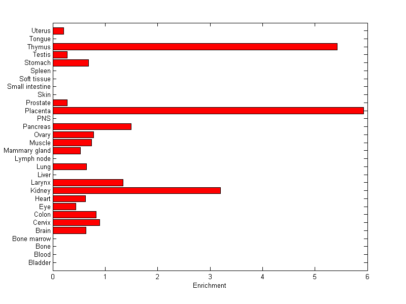 The expression level is normalized with tissue-library size. Each value for a gene in a tissue is a ratio of observed ESTs to the expected one in this tissue. The expected number of ESTs is the product of total ESTs of the gene and the fraction of total ESTs in the tissue among all ESTs in 30 tissues.