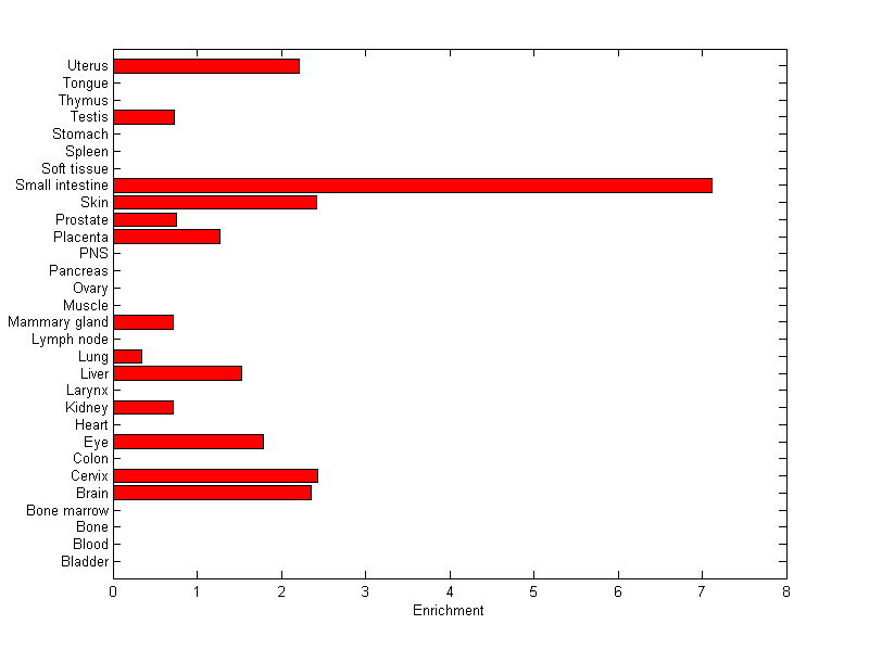The expression level is normalized with tissue-library size. Each value for a gene in a tissue is a ratio of observed ESTs to the expected one in this tissue. The expected number of ESTs is the product of total ESTs of the gene and the fraction of total ESTs in the tissue among all ESTs in 30 tissues.