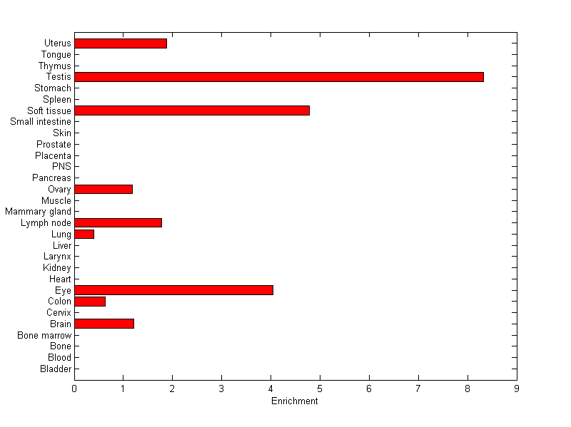 The expression level is normalized with tissue-library size. Each value for a gene in a tissue is a ratio of observed ESTs to the expected one in this tissue. The expected number of ESTs is the product of total ESTs of the gene and the fraction of total ESTs in the tissue among all ESTs in 30 tissues.