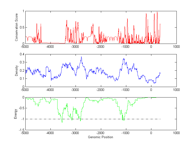 The energy profile (green curve) is about energy for module detection based on TF interaction. The positions with energy less than -1 indicate the existence of CRMs.