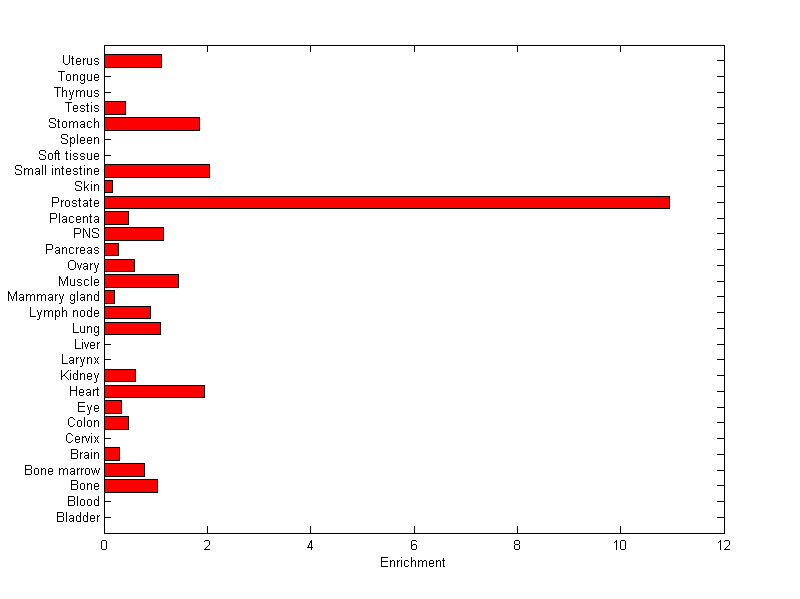 The expression level is normalized with tissue-library size. Each value for a gene in a tissue is a ratio of observed ESTs to the expected one in this tissue. The expected number of ESTs is the product of total ESTs of the gene and the fraction of total ESTs in the tissue among all ESTs in 30 tissues.