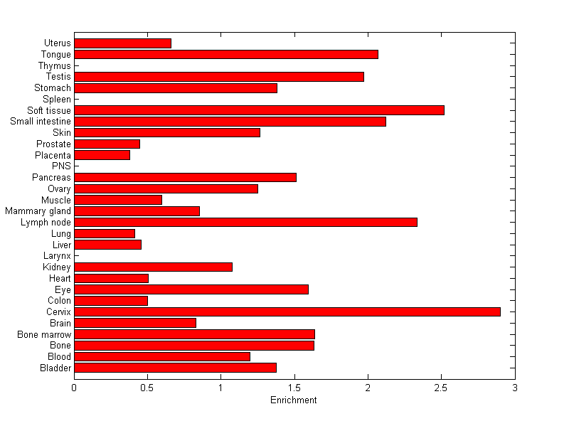 The expression level is normalized with tissue-library size. Each value for a gene in a tissue is a ratio of observed ESTs to the expected one in this tissue. The expected number of ESTs is the product of total ESTs of the gene and the fraction of total ESTs in the tissue among all ESTs in 30 tissues.