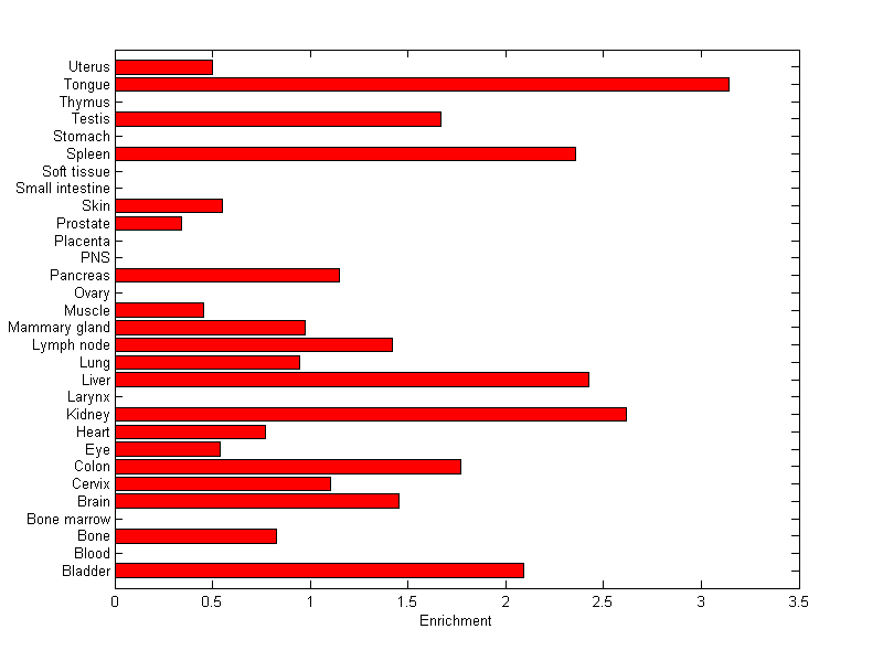 The expression level is normalized with tissue-library size. Each value for a gene in a tissue is a ratio of observed ESTs to the expected one in this tissue. The expected number of ESTs is the product of total ESTs of the gene and the fraction of total ESTs in the tissue among all ESTs in 30 tissues.