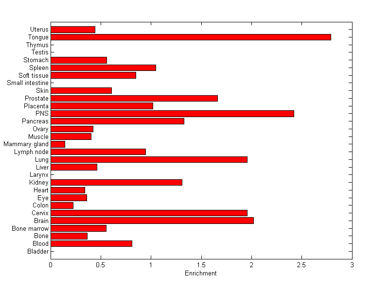 The expression level is normalized with tissue-library size. Each value for a gene in a tissue is a ratio of observed ESTs to the expected one in this tissue. The expected number of ESTs is the product of total ESTs of the gene and the fraction of total ESTs in the tissue among all ESTs in 30 tissues.