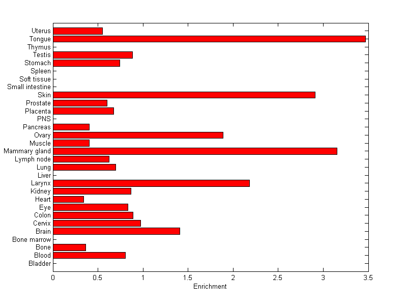The expression level is normalized with tissue-library size. Each value for a gene in a tissue is a ratio of observed ESTs to the expected one in this tissue. The expected number of ESTs is the product of total ESTs of the gene and the fraction of total ESTs in the tissue among all ESTs in 30 tissues.