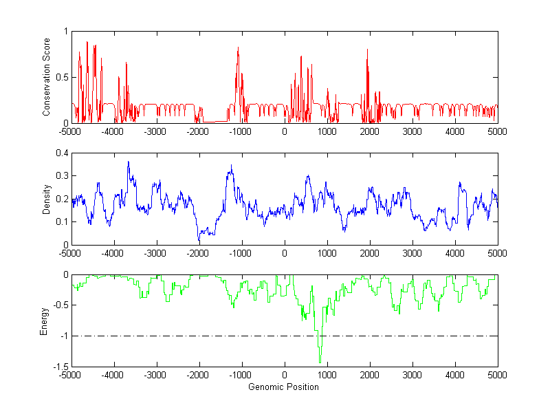 The energy profile (green curve) is about energy for module detection based on TF interaction. The positions with energy less than -1 indicate the existence of CRMs.