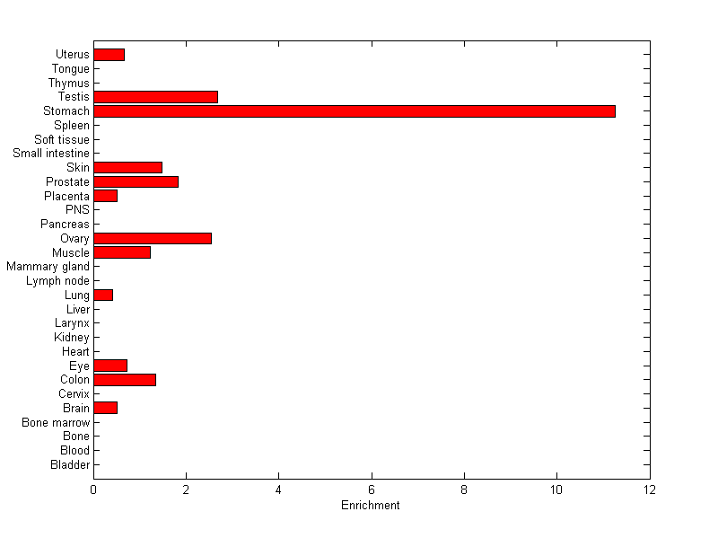 The expression level is normalized with tissue-library size. Each value for a gene in a tissue is a ratio of observed ESTs to the expected one in this tissue. The expected number of ESTs is the product of total ESTs of the gene and the fraction of total ESTs in the tissue among all ESTs in 30 tissues.