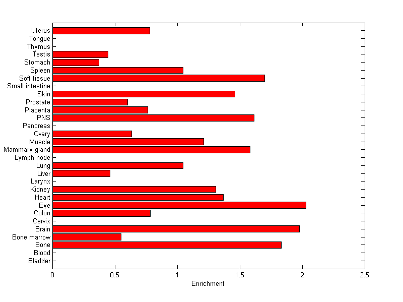 The expression level is normalized with tissue-library size. Each value for a gene in a tissue is a ratio of observed ESTs to the expected one in this tissue. The expected number of ESTs is the product of total ESTs of the gene and the fraction of total ESTs in the tissue among all ESTs in 30 tissues.