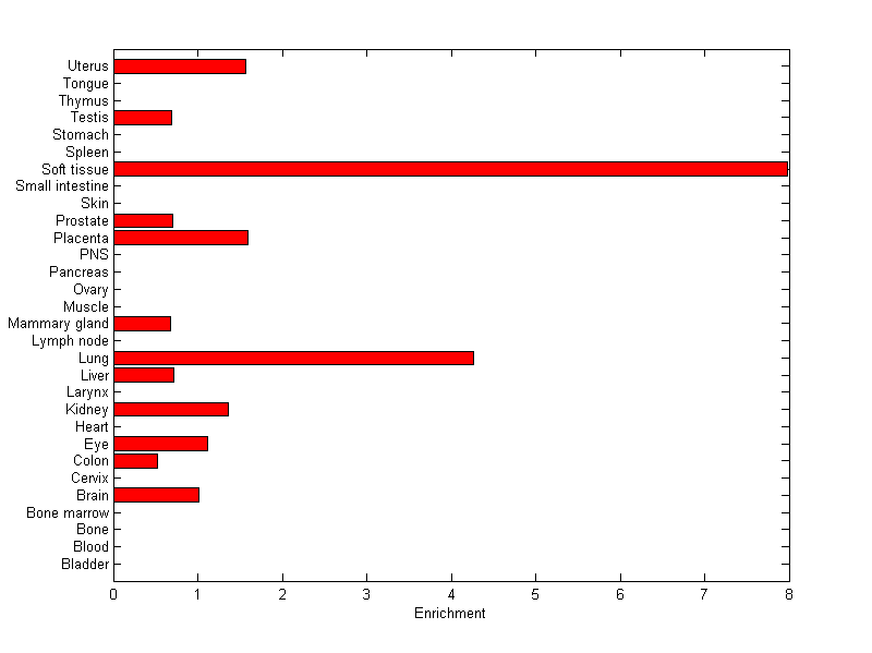 The expression level is normalized with tissue-library size. Each value for a gene in a tissue is a ratio of observed ESTs to the expected one in this tissue. The expected number of ESTs is the product of total ESTs of the gene and the fraction of total ESTs in the tissue among all ESTs in 30 tissues.