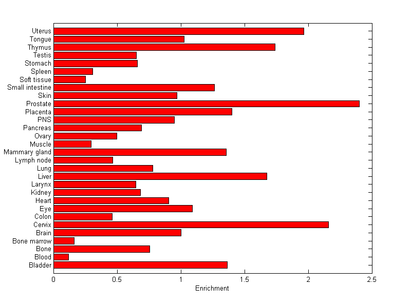 The expression level is normalized with tissue-library size. Each value for a gene in a tissue is a ratio of observed ESTs to the expected one in this tissue. The expected number of ESTs is the product of total ESTs of the gene and the fraction of total ESTs in the tissue among all ESTs in 30 tissues.