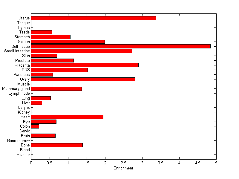 The expression level is normalized with tissue-library size. Each value for a gene in a tissue is a ratio of observed ESTs to the expected one in this tissue. The expected number of ESTs is the product of total ESTs of the gene and the fraction of total ESTs in the tissue among all ESTs in 30 tissues.