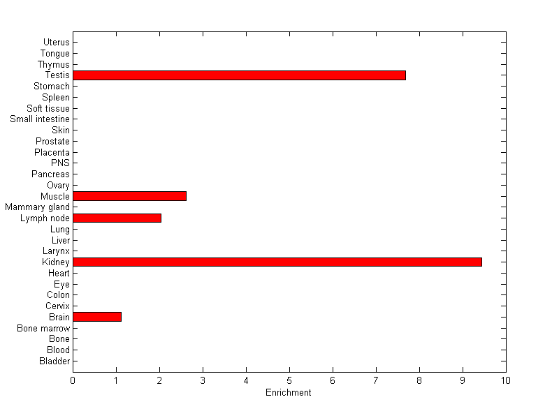 The expression level is normalized with tissue-library size. Each value for a gene in a tissue is a ratio of observed ESTs to the expected one in this tissue. The expected number of ESTs is the product of total ESTs of the gene and the fraction of total ESTs in the tissue among all ESTs in 30 tissues.