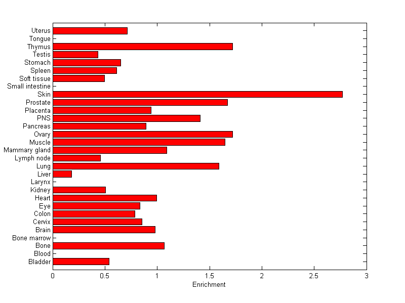 The expression level is normalized with tissue-library size. Each value for a gene in a tissue is a ratio of observed ESTs to the expected one in this tissue. The expected number of ESTs is the product of total ESTs of the gene and the fraction of total ESTs in the tissue among all ESTs in 30 tissues.