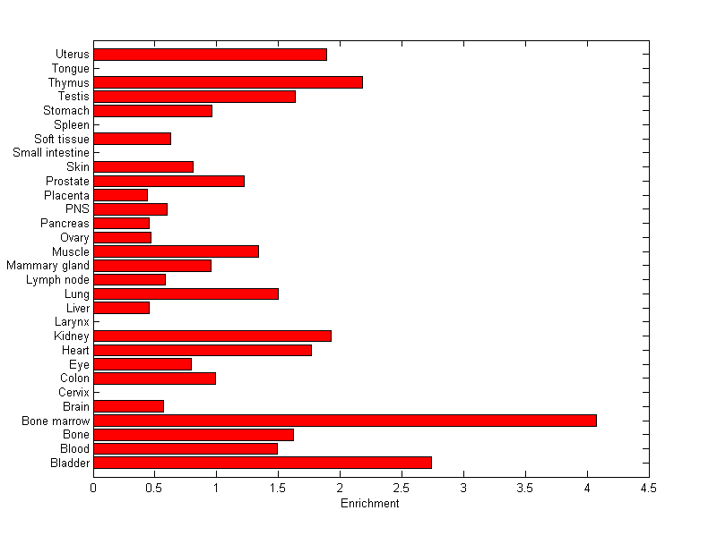 The expression level is normalized with tissue-library size. Each value for a gene in a tissue is a ratio of observed ESTs to the expected one in this tissue. The expected number of ESTs is the product of total ESTs of the gene and the fraction of total ESTs in the tissue among all ESTs in 30 tissues.