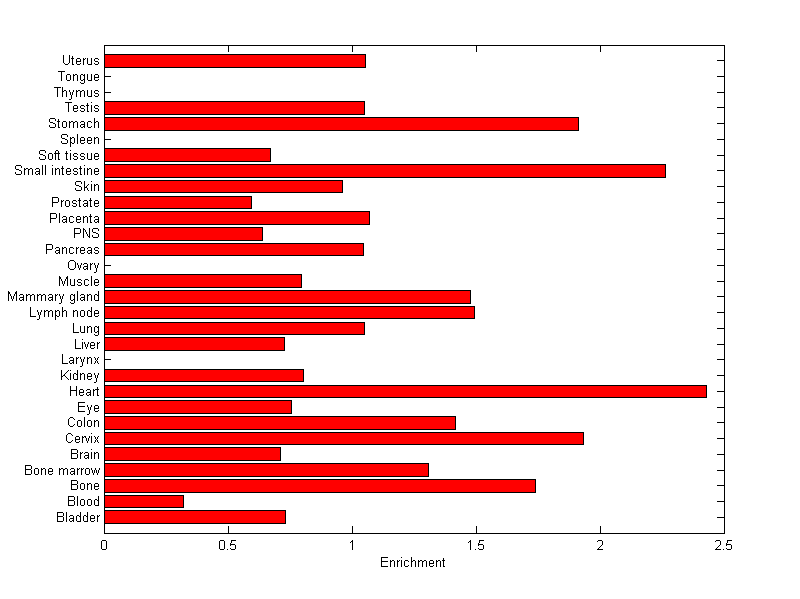 The expression level is normalized with tissue-library size. Each value for a gene in a tissue is a ratio of observed ESTs to the expected one in this tissue. The expected number of ESTs is the product of total ESTs of the gene and the fraction of total ESTs in the tissue among all ESTs in 30 tissues.