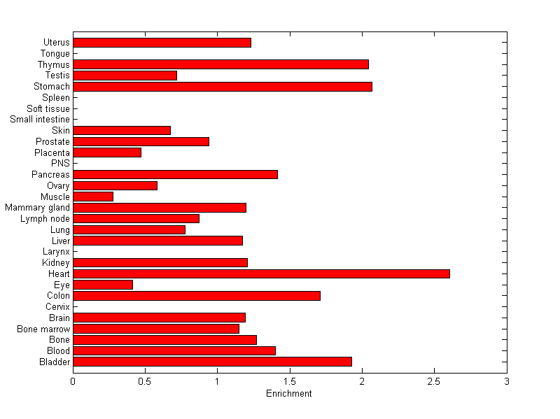 The expression level is normalized with tissue-library size. Each value for a gene in a tissue is a ratio of observed ESTs to the expected one in this tissue. The expected number of ESTs is the product of total ESTs of the gene and the fraction of total ESTs in the tissue among all ESTs in 30 tissues.