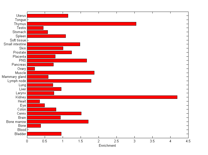 The expression level is normalized with tissue-library size. Each value for a gene in a tissue is a ratio of observed ESTs to the expected one in this tissue. The expected number of ESTs is the product of total ESTs of the gene and the fraction of total ESTs in the tissue among all ESTs in 30 tissues.