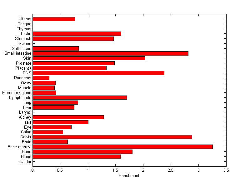 The expression level is normalized with tissue-library size. Each value for a gene in a tissue is a ratio of observed ESTs to the expected one in this tissue. The expected number of ESTs is the product of total ESTs of the gene and the fraction of total ESTs in the tissue among all ESTs in 30 tissues.