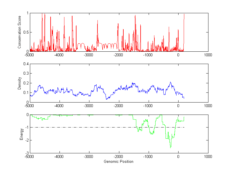 About the profiles: The conservation profile (red curve) is about conservation scores of the promoter sequences. Conservation was determined from an eight-way alignment of human, chimpanzee, dog, mouse, rat, chicken, zebrafish and fugu sequences. The conservation was quantified by a conservation score between 0 and 1, with 1 as highest conservation. The conservation score was obtained from UCSC genome databases. The density profile (blue curve) is about density of all TF binding sites. The energy profile (green curve) is about energy for module detection based on TF interaction. The positions with energy less than -1 indicate the existence of CRMs. Download: Conservation profileDensity profile Energy profile CRM summary |