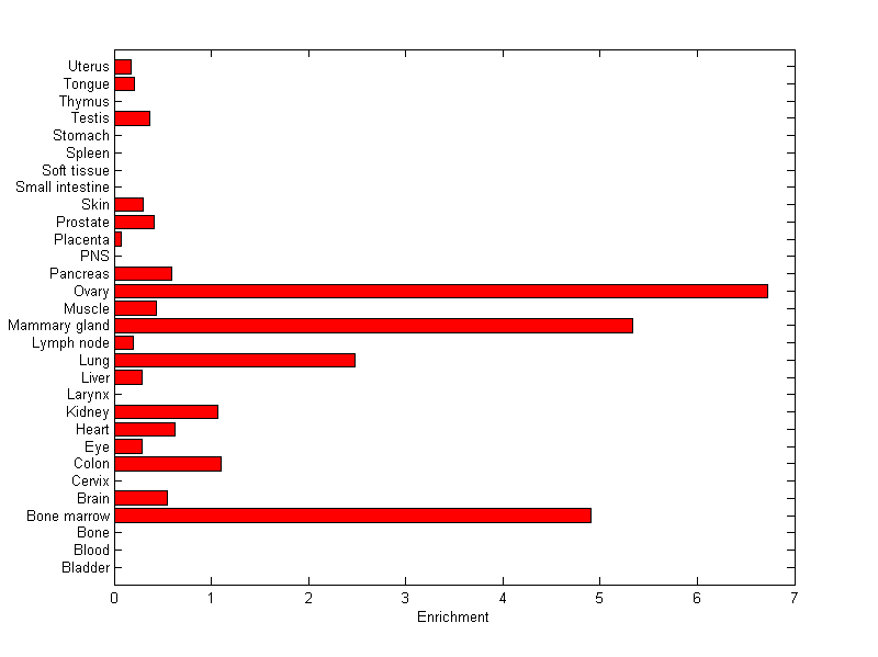 About the profile: The expression level is normalized with tissue-library size. Each value for a gene in a tissue is a ratio of observed ESTs to the expected one in this tissue. The expected number of ESTs is the product of total ESTs of the gene and the fraction of total ESTs in the tissue among all ESTs in 30 tissues. Summary: This gene is preferentially expressed in [mammary_gland, ovary] Download: |