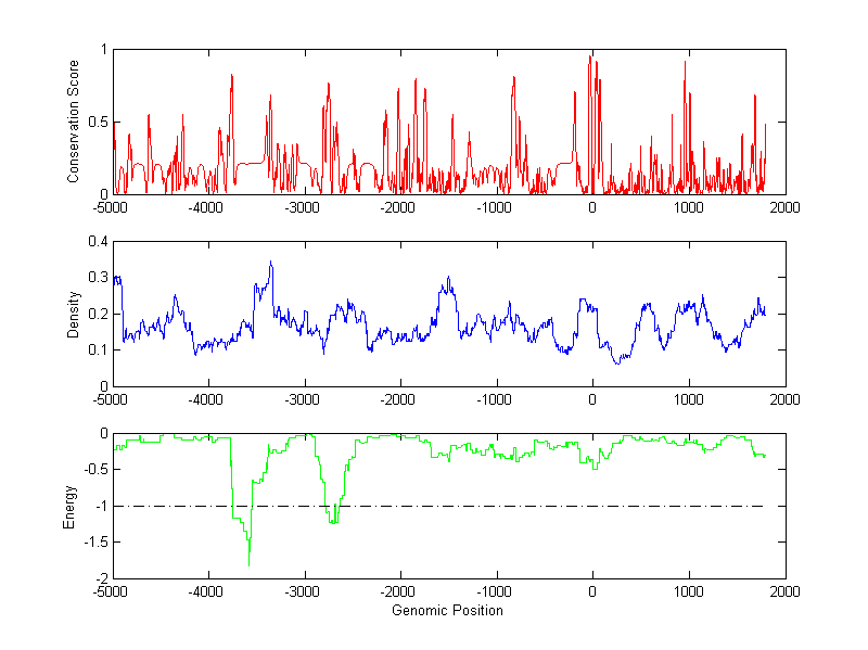 The energy profile (green curve) is about energy for module detection based on TF interaction. The positions with energy less than -1 indicate the existence of CRMs.