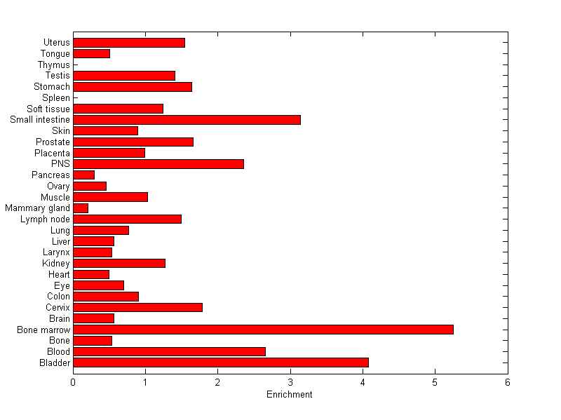 The expression level is normalized with tissue-library size. Each value for a gene in a tissue is a ratio of observed ESTs to the expected one in this tissue. The expected number of ESTs is the product of total ESTs of the gene and the fraction of total ESTs in the tissue among all ESTs in 30 tissues.