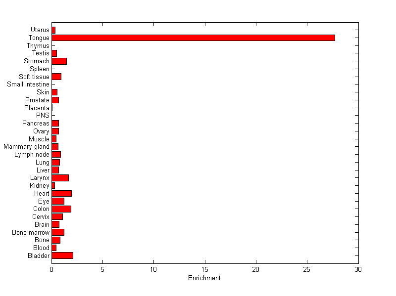 The expression level is normalized with tissue-library size. Each value for a gene in a tissue is a ratio of observed ESTs to the expected one in this tissue. The expected number of ESTs is the product of total ESTs of the gene and the fraction of total ESTs in the tissue among all ESTs in 30 tissues.