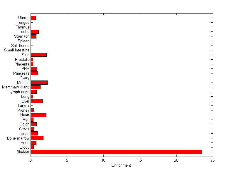 The expression level is normalized with tissue-library size. Each value for a gene in a tissue is a ratio of observed ESTs to the expected one in this tissue. The expected number of ESTs is the product of total ESTs of the gene and the fraction of total ESTs in the tissue among all ESTs in 30 tissues.