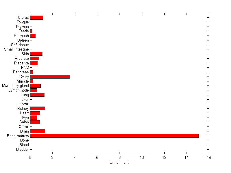 The expression level is normalized with tissue-library size. Each value for a gene in a tissue is a ratio of observed ESTs to the expected one in this tissue. The expected number of ESTs is the product of total ESTs of the gene and the fraction of total ESTs in the tissue among all ESTs in 30 tissues.