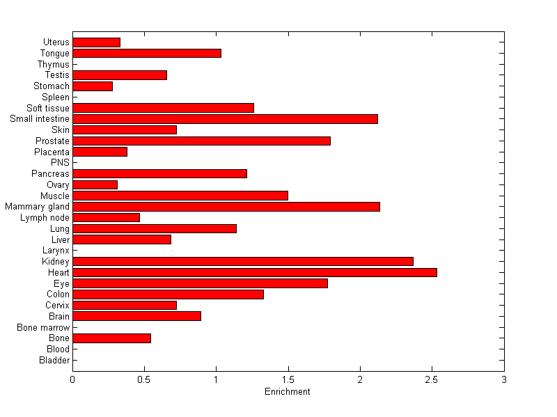 The expression level is normalized with tissue-library size. Each value for a gene in a tissue is a ratio of observed ESTs to the expected one in this tissue. The expected number of ESTs is the product of total ESTs of the gene and the fraction of total ESTs in the tissue among all ESTs in 30 tissues.