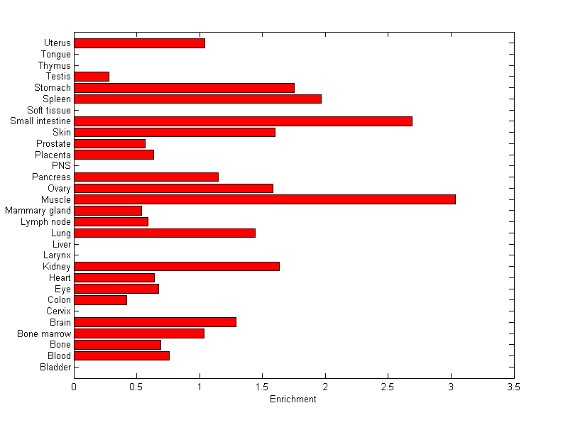 The expression level is normalized with tissue-library size. Each value for a gene in a tissue is a ratio of observed ESTs to the expected one in this tissue. The expected number of ESTs is the product of total ESTs of the gene and the fraction of total ESTs in the tissue among all ESTs in 30 tissues.