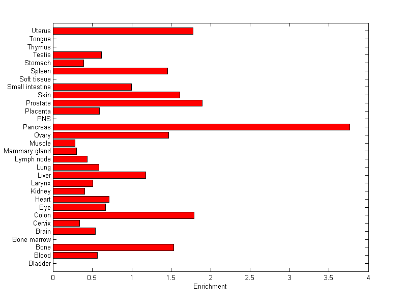 The expression level is normalized with tissue-library size. Each value for a gene in a tissue is a ratio of observed ESTs to the expected one in this tissue. The expected number of ESTs is the product of total ESTs of the gene and the fraction of total ESTs in the tissue among all ESTs in 30 tissues.