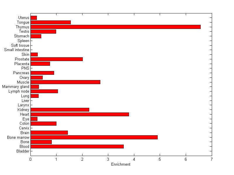 The expression level is normalized with tissue-library size. Each value for a gene in a tissue is a ratio of observed ESTs to the expected one in this tissue. The expected number of ESTs is the product of total ESTs of the gene and the fraction of total ESTs in the tissue among all ESTs in 30 tissues.