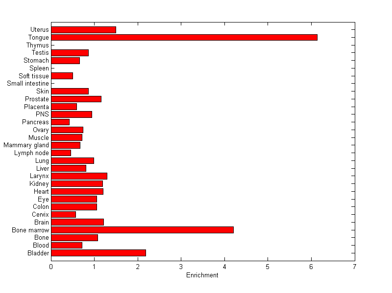 The expression level is normalized with tissue-library size. Each value for a gene in a tissue is a ratio of observed ESTs to the expected one in this tissue. The expected number of ESTs is the product of total ESTs of the gene and the fraction of total ESTs in the tissue among all ESTs in 30 tissues.