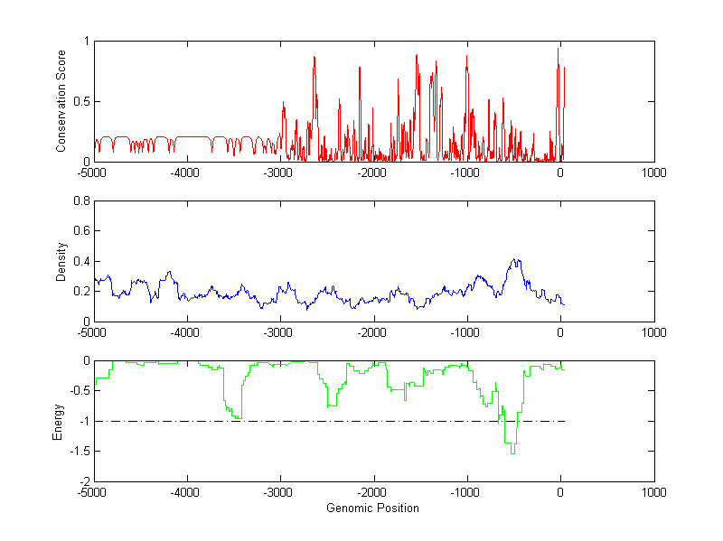 The energy profile (green curve) is about energy for module detection based on TF interaction. The positions with energy less than -1 indicate the existence of CRMs.