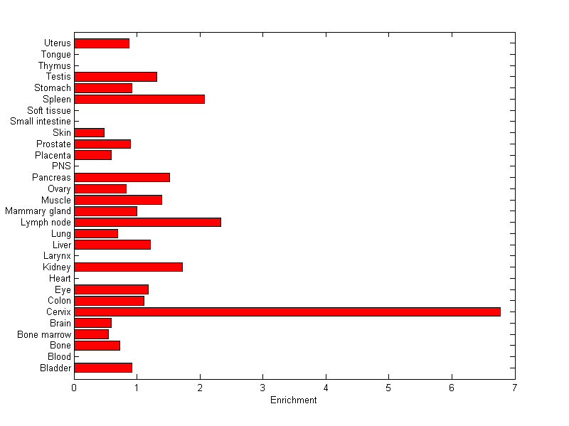 The expression level is normalized with tissue-library size. Each value for a gene in a tissue is a ratio of observed ESTs to the expected one in this tissue. The expected number of ESTs is the product of total ESTs of the gene and the fraction of total ESTs in the tissue among all ESTs in 30 tissues.