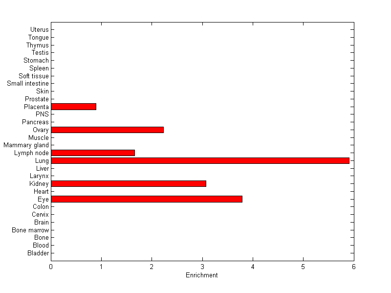 About the profile: The expression level is normalized with tissue-library size. Each value for a gene in a tissue is a ratio of observed ESTs to the expected one in this tissue. The expected number of ESTs is the product of total ESTs of the gene and the fraction of total ESTs in the tissue among all ESTs in 30 tissues. Summary: This gene is preferentially expressed in [lung] Download: |