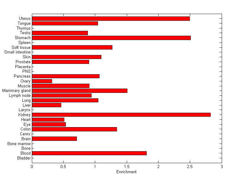 The expression level is normalized with tissue-library size. Each value for a gene in a tissue is a ratio of observed ESTs to the expected one in this tissue. The expected number of ESTs is the product of total ESTs of the gene and the fraction of total ESTs in the tissue among all ESTs in 30 tissues.