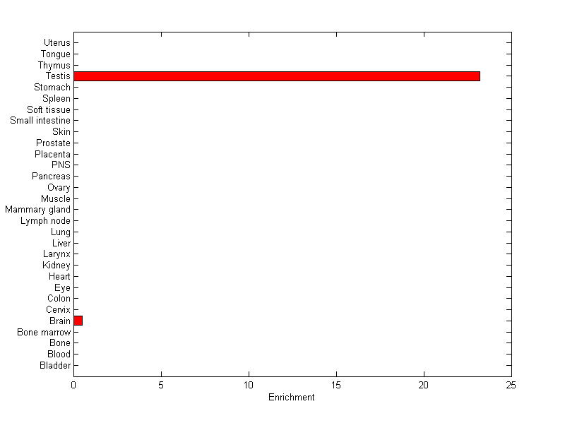 The expression level is normalized with tissue-library size. Each value for a gene in a tissue is a ratio of observed ESTs to the expected one in this tissue. The expected number of ESTs is the product of total ESTs of the gene and the fraction of total ESTs in the tissue among all ESTs in 30 tissues.