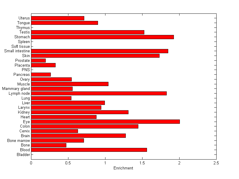 The expression level is normalized with tissue-library size. Each value for a gene in a tissue is a ratio of observed ESTs to the expected one in this tissue. The expected number of ESTs is the product of total ESTs of the gene and the fraction of total ESTs in the tissue among all ESTs in 30 tissues.