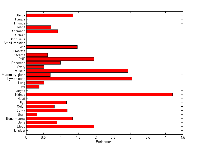 The expression level is normalized with tissue-library size. Each value for a gene in a tissue is a ratio of observed ESTs to the expected one in this tissue. The expected number of ESTs is the product of total ESTs of the gene and the fraction of total ESTs in the tissue among all ESTs in 30 tissues.